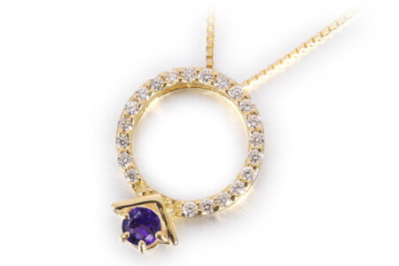 2月の誕生石「アメジスト」と21石のメレダイヤが輝く、K18イエローゴールド製の特別なベビーリングネックレス。