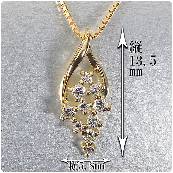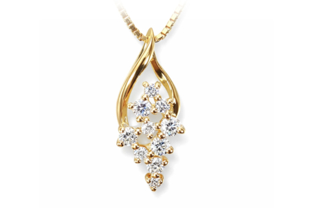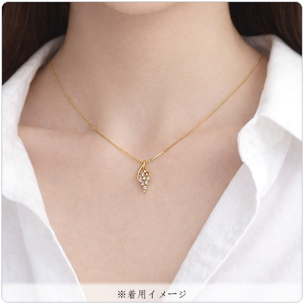 ブドウの房の様にダイヤモンドが縦に連なる遊び心のあるデザインで、イエローゴールドが胸元に華やかな彩りを添えてくれます。カジュアルからフォーマルまで幅広いシーンで活躍するでしょう。10個のダイヤがあしらわれているため、スイート10の贈物にも最適です。