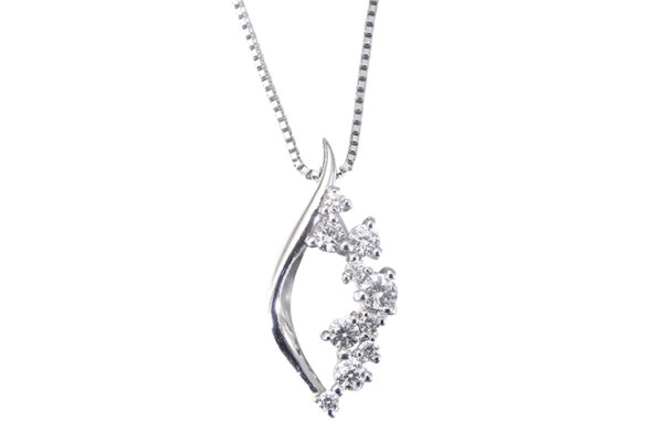 大きさの異なるダイヤモンドが絶妙なバランスで並んだペンダント。縦に並んだダイヤとプラチナの間にスペースが設けられていて、胸元のワンポイントとして存在感のある仕上がりになっています。
