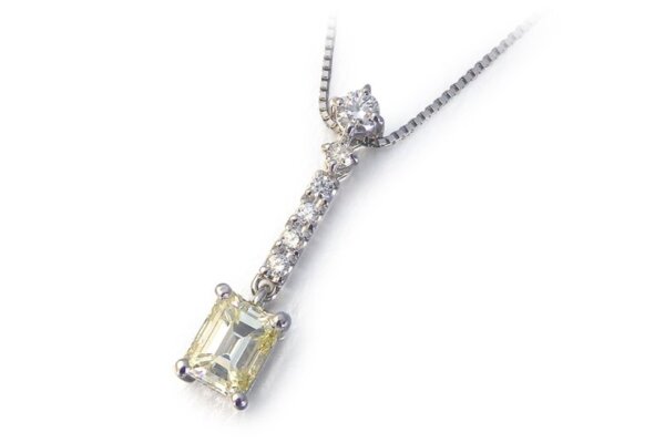 エメラルドカットは内包物が多い石には向かないカットで、この石もVS1と内包物が大変に少ない上質なダイヤモンドです。色はファンシーライトイエローで明るい黄色。縦に長いデザインは大人のテイスト。ラウンドのダイヤを持っているけど、、、という方に、お勧めのペンダントヘッドです。