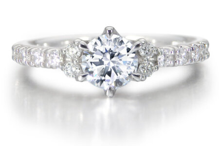 ハーフエタニティをベースにセンターストーンと14個のメレダイヤをあしらっています。泉から滾々と湧き出る清水が光を受けて周囲を照らし出している様を表現していて、華のあるリングに仕上がっています。裏面から覗くハートのマークもポイント。