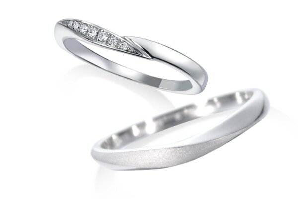 小指側から延びたダイヤのラインは、春の訪れとともに雪の下から顔をのぞかせた新緑をイメージ。男性用のマット加工は雪解けによって出来た春の小道をモチーフにしています。指に寄り添うアシンメトリーなVラインが、新たな季節を迎えるふたりを優しく包み込みます。
