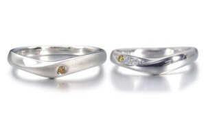 流れるようなウェーブラインが特徴的なプラチナの結婚指輪。それぞれ、センター部分にマット加工を施し、女性用にはダイヤを1石アレンジし、落ち着いた雰囲気に。