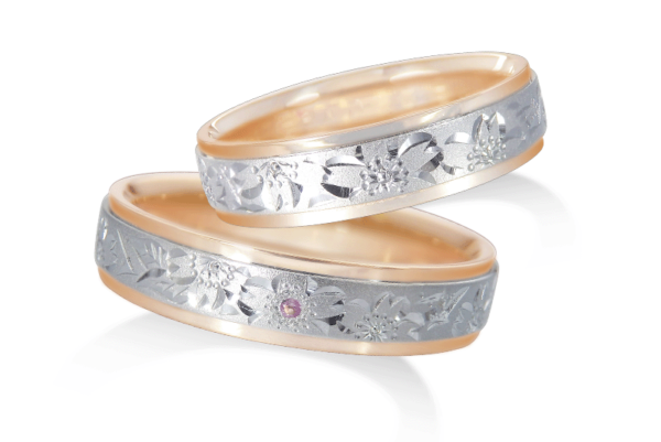幅4.5㎜でピンクゴールドをベースにプラチナとのコンビになっています。和彫りで桜の花を表現。