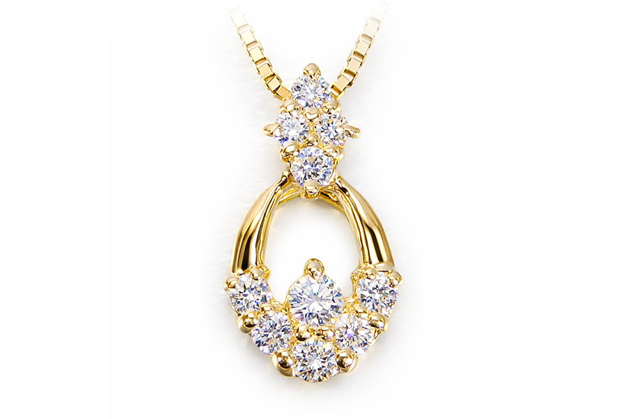 シンメトリーで全体のバランスが良く、イエローゴールドとダイヤモンドが華やかさを演出してくれるペンダント。キュート&フェミニンテイストのデザインで見る者に可愛らしい印象で普段使いもしやすいデザイン。10個のダイヤがあしらわれているため、スイートテンのジュエリーにも最適です。