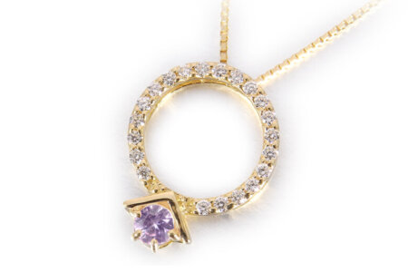 9月の誕生石「ピンクサファイア」と21石のメレダイヤが輝く、K18イエローゴールド製の特別なベビーリングネックレス。
