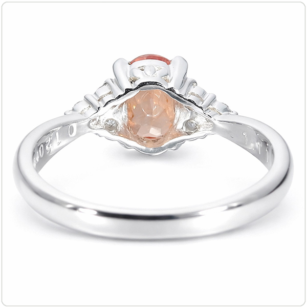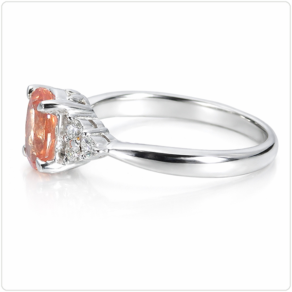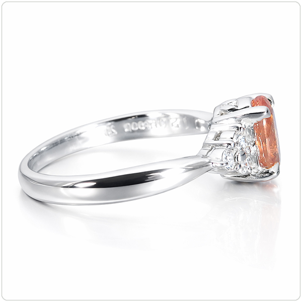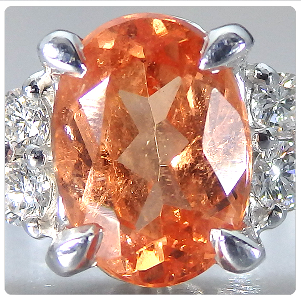 暗く沈んだような赤に近い色の物や、薄くて色が抜けてしまっている物は低評価ですが、このジェムは朱色に近い橙色で、鮮やかに発色しているのがポイントです。写真は強い光を当てた状態で撮影しているため内包物が目立ちますが、普段の状態では色の濃さに隠れてキズはほとんど目に付きません。