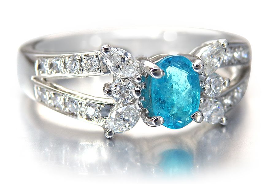 最後に、お客様から問い合わせの多いパライバの『キズ』について付け加えます。ネオンカラーで内部インクルージョン(いわゆる宝石に内包されているキズ)のないパライバは、ほとんどありません。1900年代にブラジルのバターリャ鉱山で採掘されたものの中には、魅力的なブルーでありながらキズの少ないパライバがありましたが、現在ではまずお目にかかれません。ただし、グリーンがブルーより勝っているものや、ブルーであってもネオンカラーでないものの中にはキズが少ないパライバが存在します。