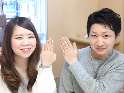 「実際にシンドバットで指輪を選んだ友達にすすめられて来店しました」とおっしゃるのはE様ご夫妻。「元々は入りづらいお店というイメージでしたが、実際に来店してみると指輪について色々と話ができて、居心地のいいお店でした。とのお言葉を頂戴してしまいました!